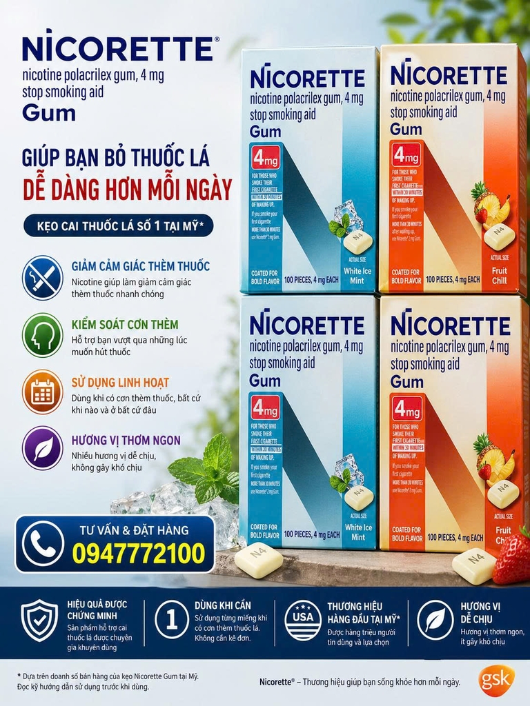 Kẹo Nhai Cai Thuốc Lá Nicorette Gum 4mg – Giải Pháp Từ Bỏ Thuốc Lá Hiệu Quả Từ Mỹ
